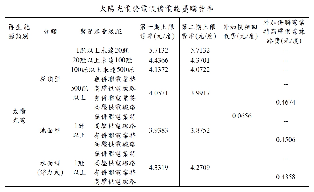 民國109年(西元 2020年)購電費率