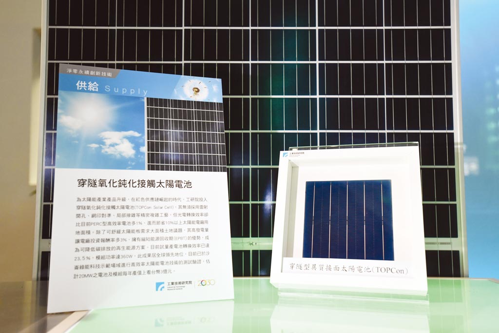 在能源局支持下,工研院開(kāi)發(fā)「穿隧氧化鈍化接觸太陽(yáng)電池」,具光電轉(zhuǎn)換效率高、投報(bào)率高、短期回收三大優(yōu)勢(shì),已與太陽(yáng)能廠茂迪合作,於沙崙綠能科技示範(fàn)場(chǎng)域進(jìn)行測(cè)試驗(yàn)證,試量產(chǎn)線之電池轉(zhuǎn)換效率達(dá)23.5%,模組功率達(dá)360W,成果全球領(lǐng)先;初估20MW之電池及模組每年產(chǎn)值上看臺(tái)幣3億元。光電轉(zhuǎn)換效率比目前鈍化射極和背面(PERC)型高效率電池多1~2%,能節(jié)省10%以上太陽(yáng)能電廠用地面積,並改善在陰雨天等低照度時(shí)的發(fā)電能力與烈日下的高溫衰減達(dá)3%,助攻零碳電力的終極目標(biāo)。